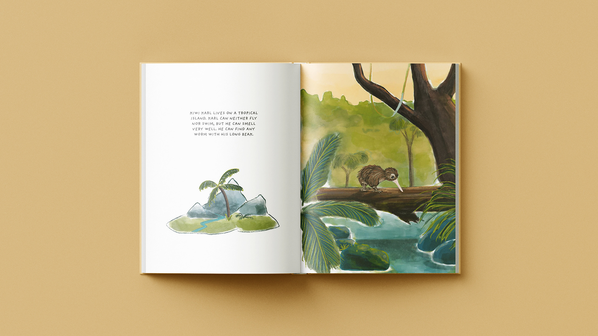 Kiwi Karl and his sister live on a tropical island. One day, his sister is swept away in the river during a storm. Kiwi Karl sets off on an adventurous search. The children's book was created as part of a project course entitled “Little Adventurers”. It invites you to accompany Kiwi Karl on his search for his sister and to experience some of the hurdles on his journey. Themes such as friendship, overcoming fear and success play a role in the story.